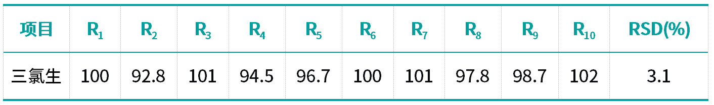 表 2 三氯生回收率(%)及RSD值(n=10)